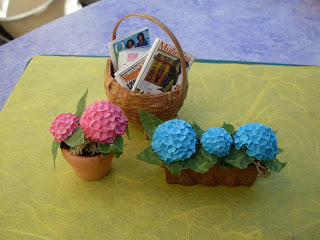 You can choose between the little pink/great blue and little blue/great pink hydrangeas and it also adds 10 magazines in a basket. The hydrangeas are handmade by me.